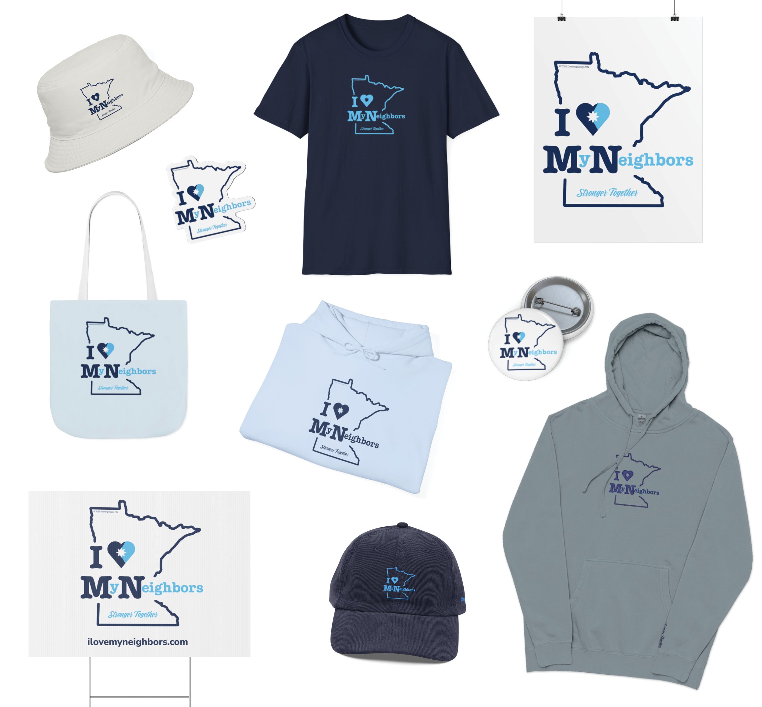 The I Love My Neighbors Collection was created as a simple, visible way to stand with our community during times that call for care, courage, and connection. Rooted in Minnesota values, each piece is designed to be worn and shared as a reminder that real change begins close to home.